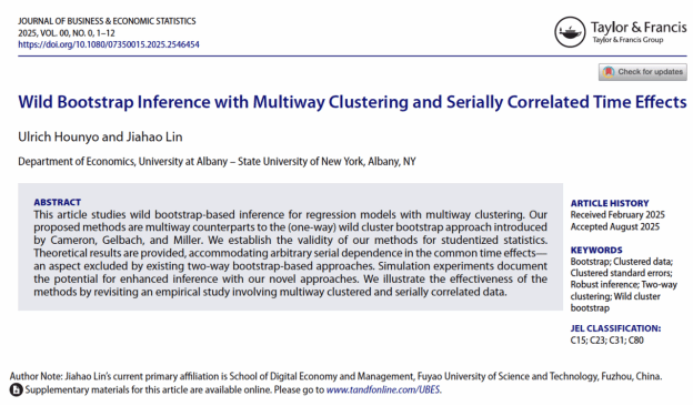 近日,我院林家豪研究助理教授与合作者Ulrich Hounyo完成的论文 《Wild Bootstrap Inference with Multiway Clustering and Serially Correlated Time Effects》 在《Journal of Business & Economic Statistics》在线发表。《Journal of Business & Economic Statistics》为国际统计与计量经济学领域的重要学术期刊,在英国商学院协会特许协会(Chartered Association of Business Schools, Chartered ABS)发布的《Academic Journal Guide 2024》中被评为 ABS 4 期刊,具有较高的学术影响力。